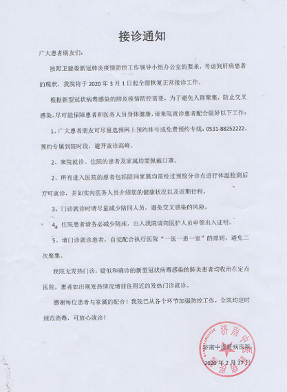 按照卫健委新冠肺炎疫情防控工作领导小组办公室的要求,考虑到肝病患者的现状,我院将于2020年3月1日起全面恢复正常接诊工作。