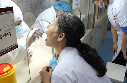 1、采样阶段:工作人员用一根特制的长棉签,深入被试者口咽沾取一部分分泌物作为样本。