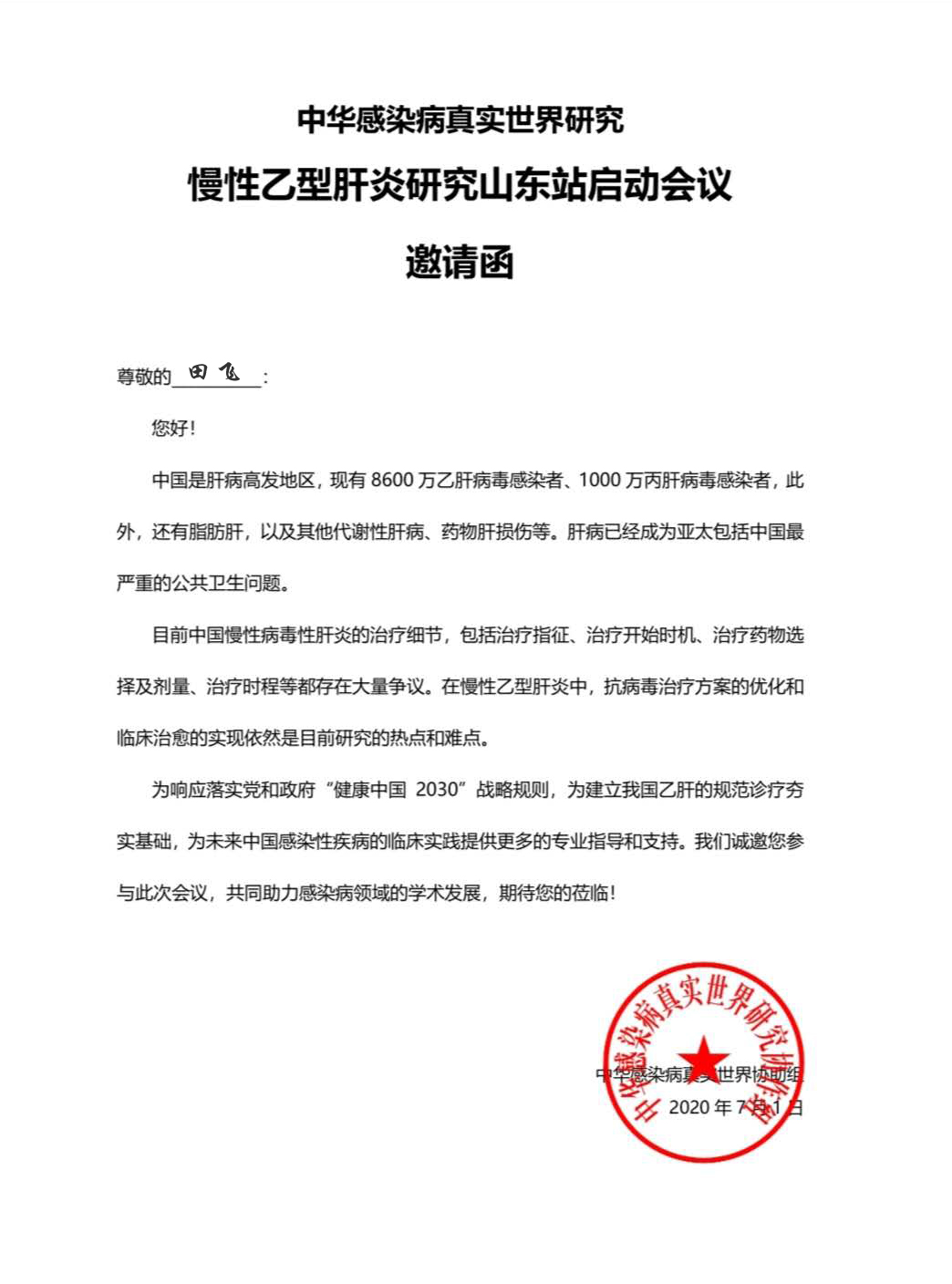 受中华感染病真实世界研究协会的邀请,我院宋现祯院长、洪臣主任、田飞主任将参加7月4日下午的慢性乙型肝炎研究山东站启动会议,与知名专家张文宏等教授一起线上讨论慢性乙型肝炎的各项课题。